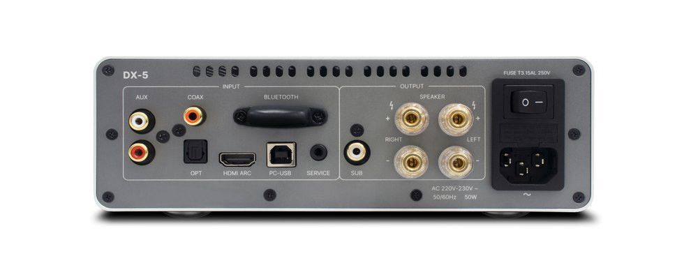 A DX-5 a források széles skáláját támogatja, beleértve a PC-USB bemenetet akár 32 bites/384 kHz-es PCM és DSD 4x (DoP-vel) feldolgozással, a koaxiális és optikai digitális bemeneteket (akár 24bit / 192kHz), valamint az aptXTM HD és AAC Bluetooth-t a nagy felbontású vezeték nélküli audio streaminghez. Egy pár RCA analóg bemenet biztosítja a csatlakoztathatóságot minden hagyományos forráshoz, például CD-lejátszókhoz és olyan lemezjátszókhoz, amelyek vonalszintű kimenettel rendelkeznek.