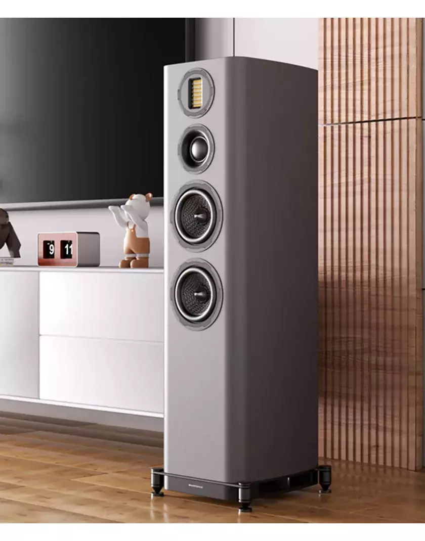 A hibrid lábazat, amely a szekrény részleteinek fém és fa elemeit ötvözi, fokozza a szerkezeti integritást és csökkenti a nem kívánt rezgéseket. Ez az innovatív talp biztosítja, hogy a hang tiszta és színtelen maradjon, mentes a külső rezonanciajelektől.